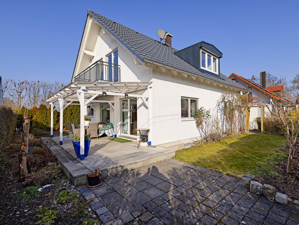 In einer der begehrtesten und grünsten Ecken Feldmochings befindet sich dieses freistehende Zweifamilienhaus, ruhig gelegen zwischen dem Würmkanal und den vielen Seen des Feldmochinger Umlands. Das in 2001 errichtete Fertighaus bietet mit zwei getrennten Wohneinheiten vielfältige Nutzungsszenarien für Eigennutzer und Kapitalanleger.