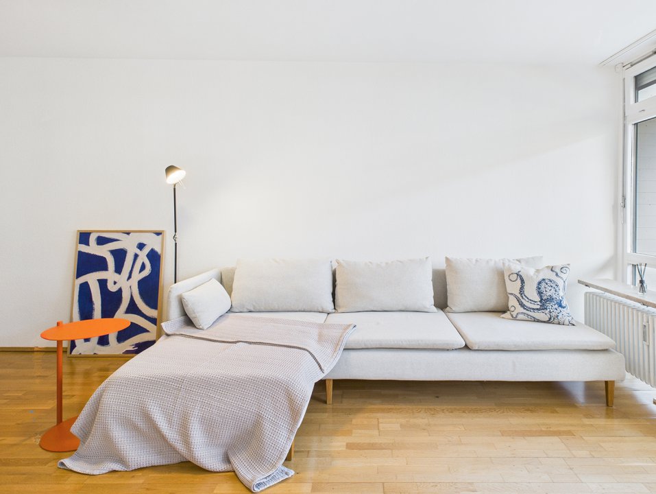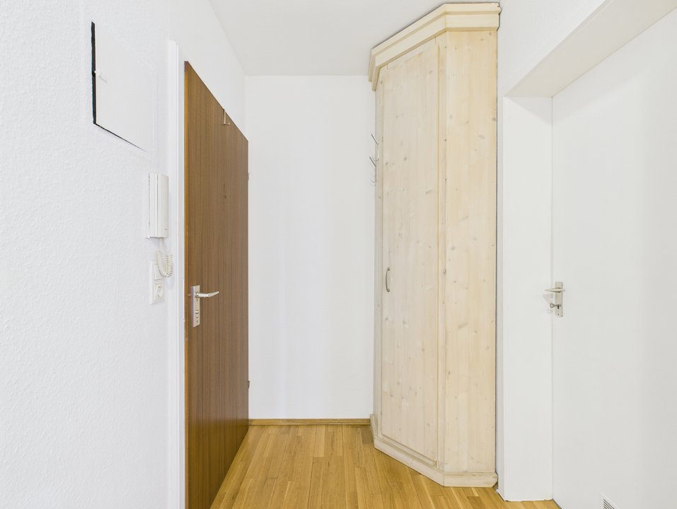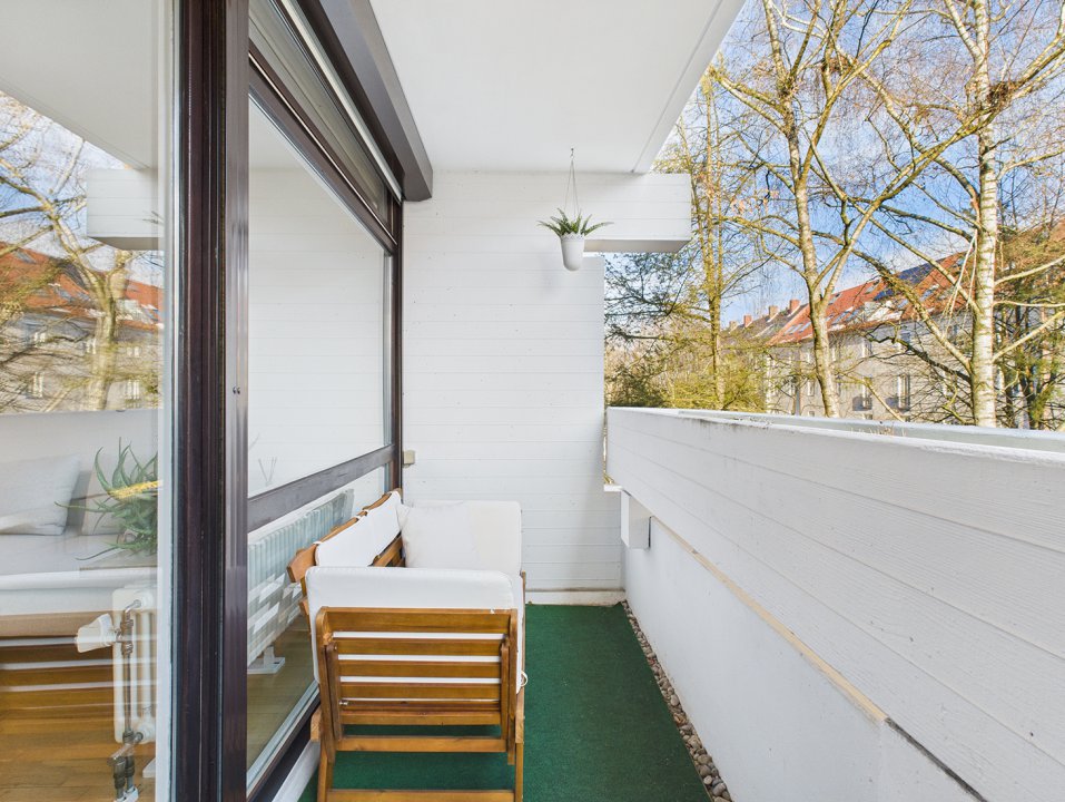 Die breite Fensterfront lässt über den großen Balkon viel Licht in sämtliche Wohnräume. Das Badezimmer mit Wanne sowie eine gut ausgestattete Einbauküche runden das Angebot ab. Im Flur ermöglichen clever geplante Einbaumöbel Garderobe und Home Office miteinander zu verbinden.