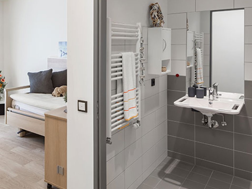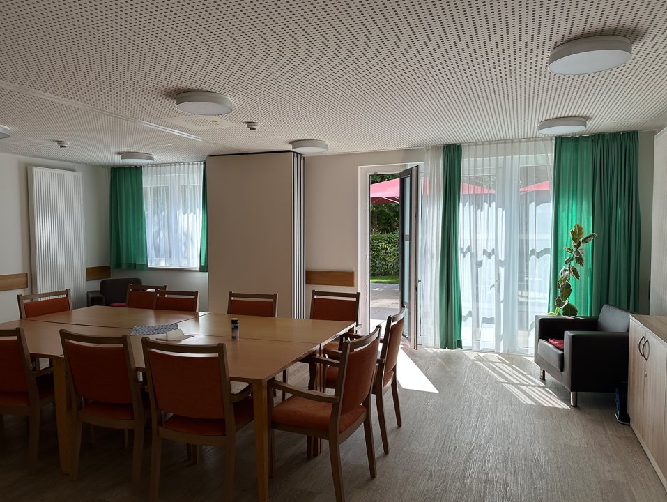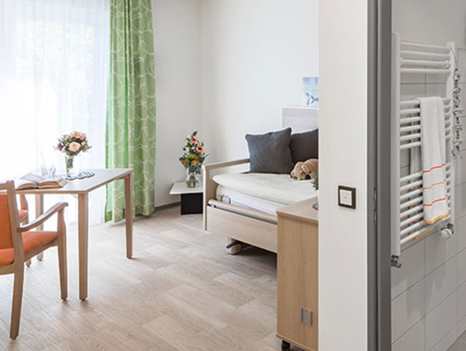 Die rund 25 Quadratmeter große Pflegeeinheit präsentiert sich in einem neuwertigen Zustand und wurde mit einem durchdachten Fokus auf Komfort, Funktionalität und Barrierefreiheit gestaltet. Helle Farben, große Fensterflächen und eine harmonische Materialwahl schaffen ein angenehmes Raumgefühl.