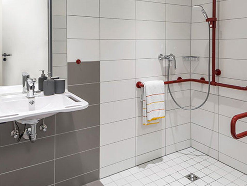 Der Grundriss bietet ausreichend Bewegungsfreiheit – auch für Bewohnerinnen und Bewohner, die auf einen Rollstuhl angewiesen sind. Das eigene Badezimmer ist mit einer großzügigen Dusche, einem WC sowie rutschhemmenden Fliesen ausgestattet und enthält Halte- und Stützgriffe zur sicheren Nutzung. Weitere Ausstattungselemente sind elektrische Rollläden und eine kontrollierte Wohnraumlüftung mit Wärmerückgewinnung. Die vorhandene Möblierung ist hochwertig und funktional gewählt. Eine individuelle Ergänzung der Ausstattung ist möglich und kann nach den