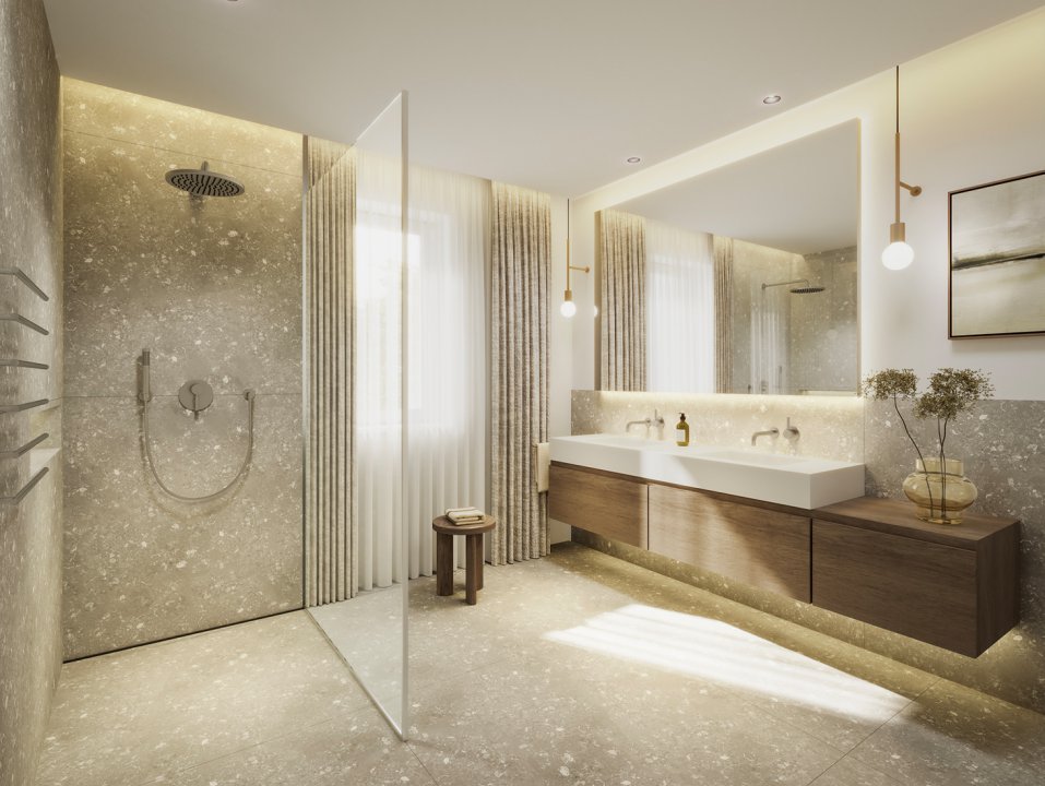 Der Grundriss lässt keine Wünsche offen: Der Masterbereich mit großem Badezimmer, Ankleide und Schlafzimmer bildet ein exklusives Refugium. Zwei größzügige Kinder-/Gästezimmer mit je mehr als 18 m² und eigenem Bad sprechen für sich. Hochwertige Materialien und moderne Technik werden höchsten Ansprüchen gerecht. Sei es der offene Kamin, die smarte Steuerung der Wohnung und Klimaanlage mittels KNX Technologie oder Feinsteinzeug in Natursteinoptik im Badezimmer - hier wurde an alles gedacht.