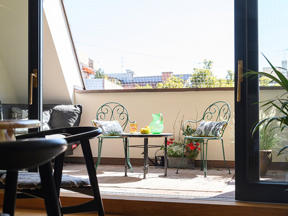Über den repräsentativen Empfang mit imposanter Lichtdecke gelangt man in den großzügigen Koch- und Essbereich mit einer Raumhöhe von ca. 3,8m. Die freigelegte Ziegelwand, die mit schwarzem Stahl gefassten Glastüren und das französische Fischgrat-Parkett treten in einen spannenden Dialog. Die Einbauküche der Schreinerei Birmoser/Miesbach ist handwerklich perfekt gearbeitet und farblich auf das Konzept der Wohnung abgestimmt.