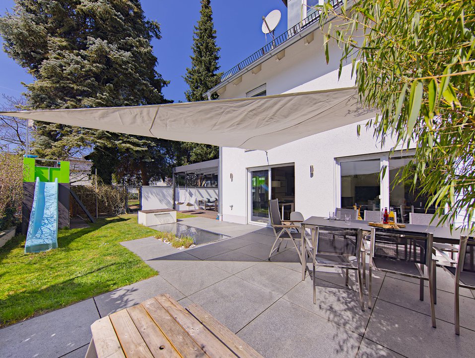 Auch der Außenraum ist klar und ästhetisch angelegt: Zwei Terrassenflächen