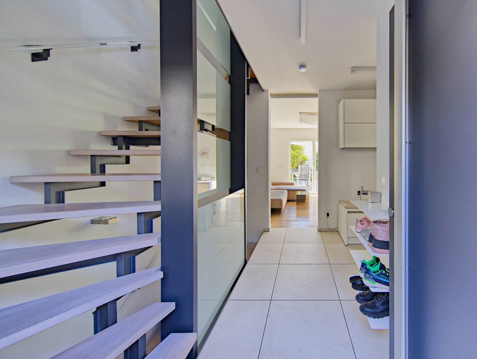 designte Stahltreppe im Herzen des Hauses sowie das überhohe Carport mit Werkstatt