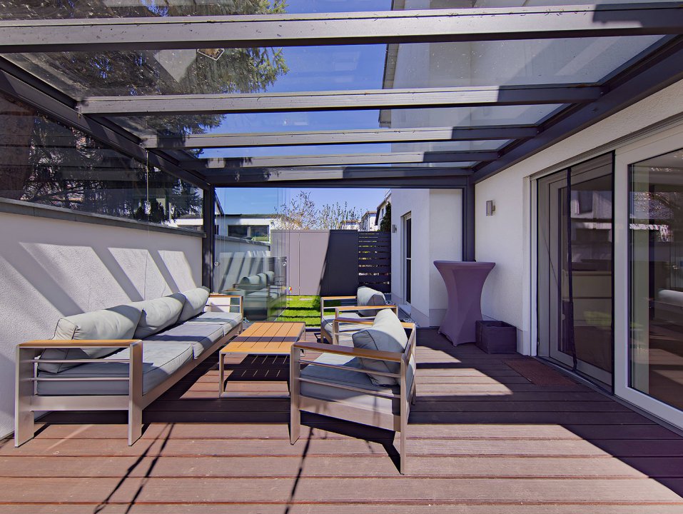wie die mit Glas überdachte Loggia, das Eingangstor mit Glasdach, die offen