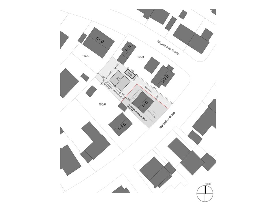 Das Baurecht für das Gebäude mit EG, OG und optionalem Keller wurde mit der Baubehörde Nürnberg mit anliegender Skizze vorbesprochen. Die im ursprünglichen B-Plan Nr. 3534 festgesetzte Baugrenze kann aufgrund von bereits vorhandenen Bezugsfällen durch die Baueingabe mit einer Befreiung gerechnet werden.